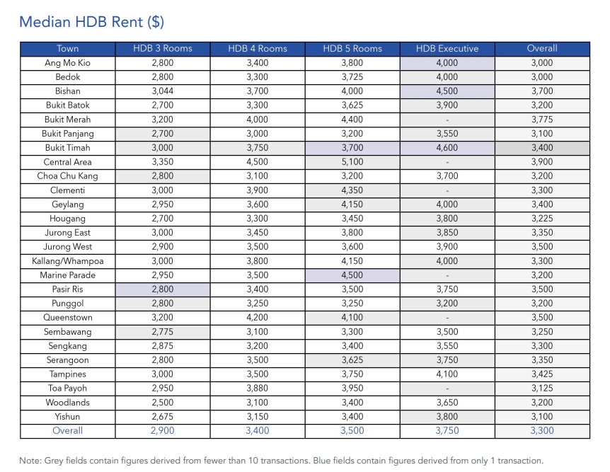 根据新加坡房地产门户网站 (SRX / 99.co) 2025年11月的预估数据,各类组屋的月度租金中位数大致如下: