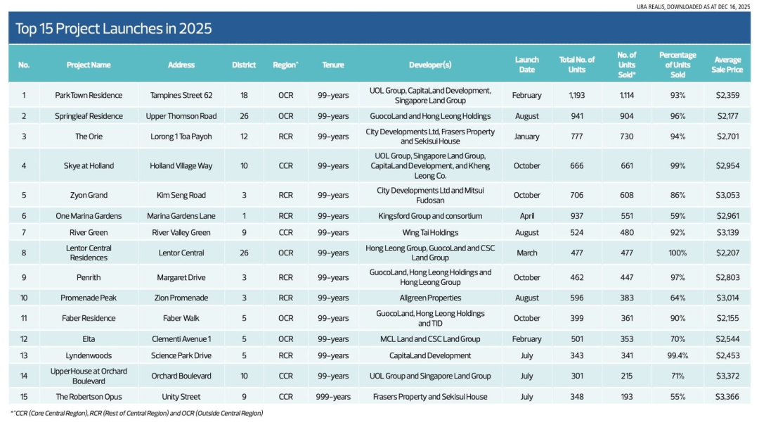 销量冠军是ParkTown Residences(1,193套单位),为2025年唯一推出的超大型项目。该项目由华业集团、新加坡土地集团与凯德地产联合开发,属99年地契的综合用途项目,规划配有商场并与交通枢纽——淡滨尼北地铁站(跨岛线)及巴士转换站——无缝衔接。该项目在2月开盘周末取得87%的认购率,截至12月16日已售出93%。