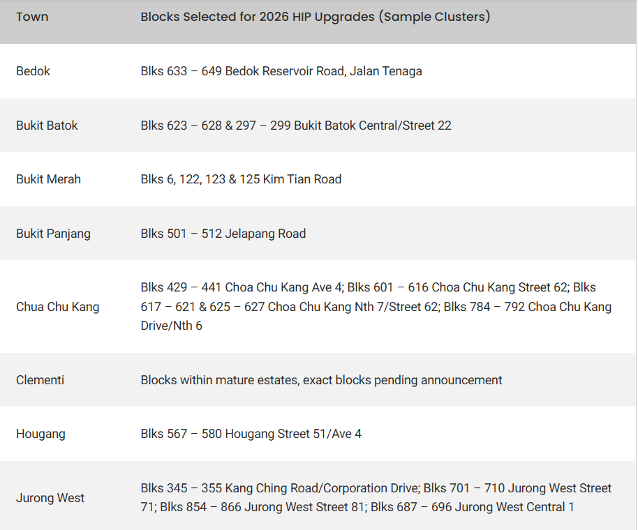 根据最新发布的信息,2026年组屋家居改进计划(HIP)翻新时间表所涵盖的市镇和街区如下: