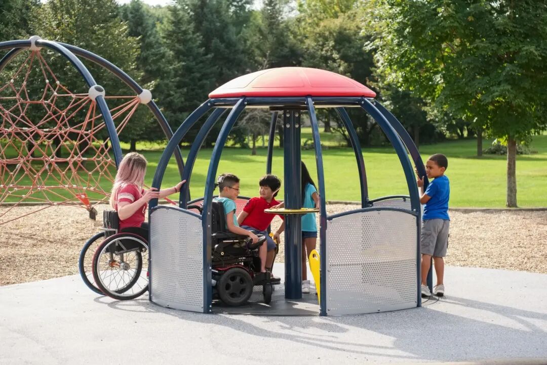 陶艺家花园游乐场由 CT-Art Creation 设计,沙坑旁有四人面对面互动秋千,设遮蔽式旋转木马、音乐鼓,主打全龄共享,鼓励亲子同玩,另有配备引体向上站、电动自行车的健身区。