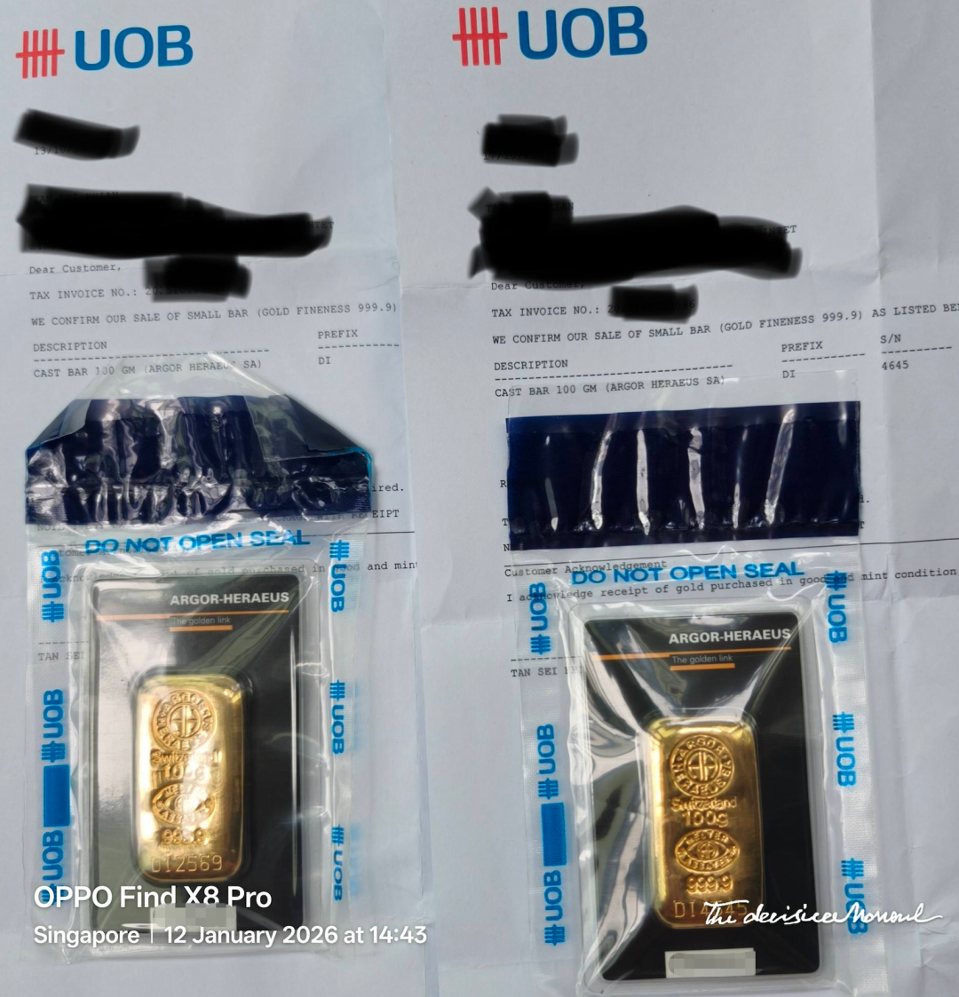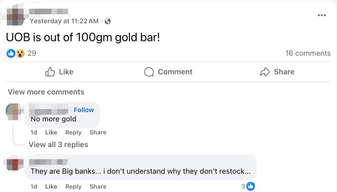 昨天新加坡有网友发帖:大华银行的100g金条被抢空了!