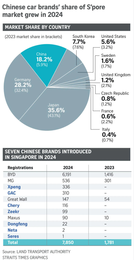 在汽车领域,中国品牌的进入也相当显眼。仅 2024 年数据,新加坡注册的中国汽车品牌共有 11 个品牌。这包括 BYD、MG(名爵)、Xpeng、Omoda/Chery 等新能源汽车品牌。而且中国车品牌 2025 年仍在持续新增入市,预计未来还会有更多加入。