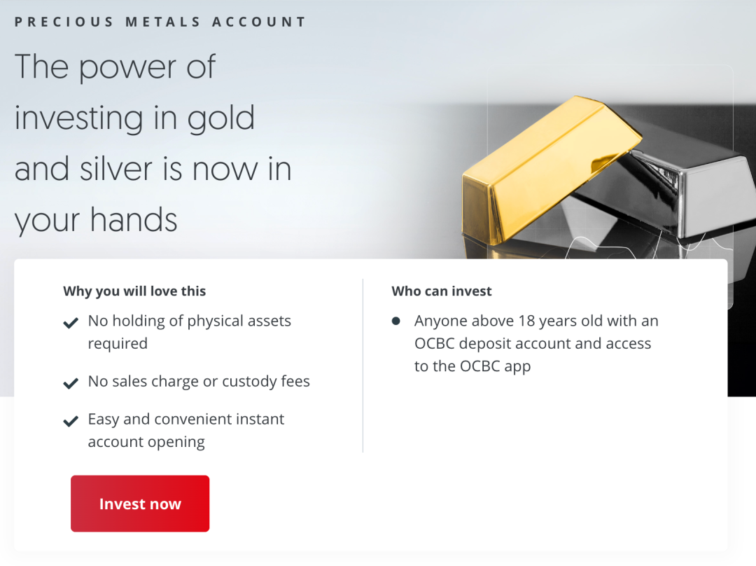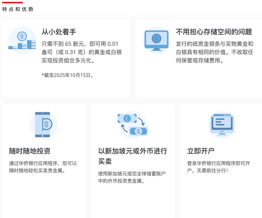 例如华侨银行,最低投资额仅为0.01盎司(或0.31克),无需实物存储,对散户友好。开户条件就是需要先有一个华侨银行存款账户。↓