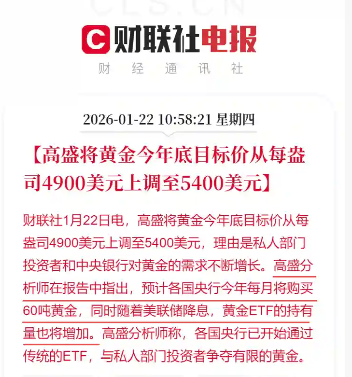 高盛发布最新预测,将黄金今年年底目标价从每盎司 4900 美元上调至 5400 美元,原因是私人投资者和各国央行对黄金的需求持续走高。