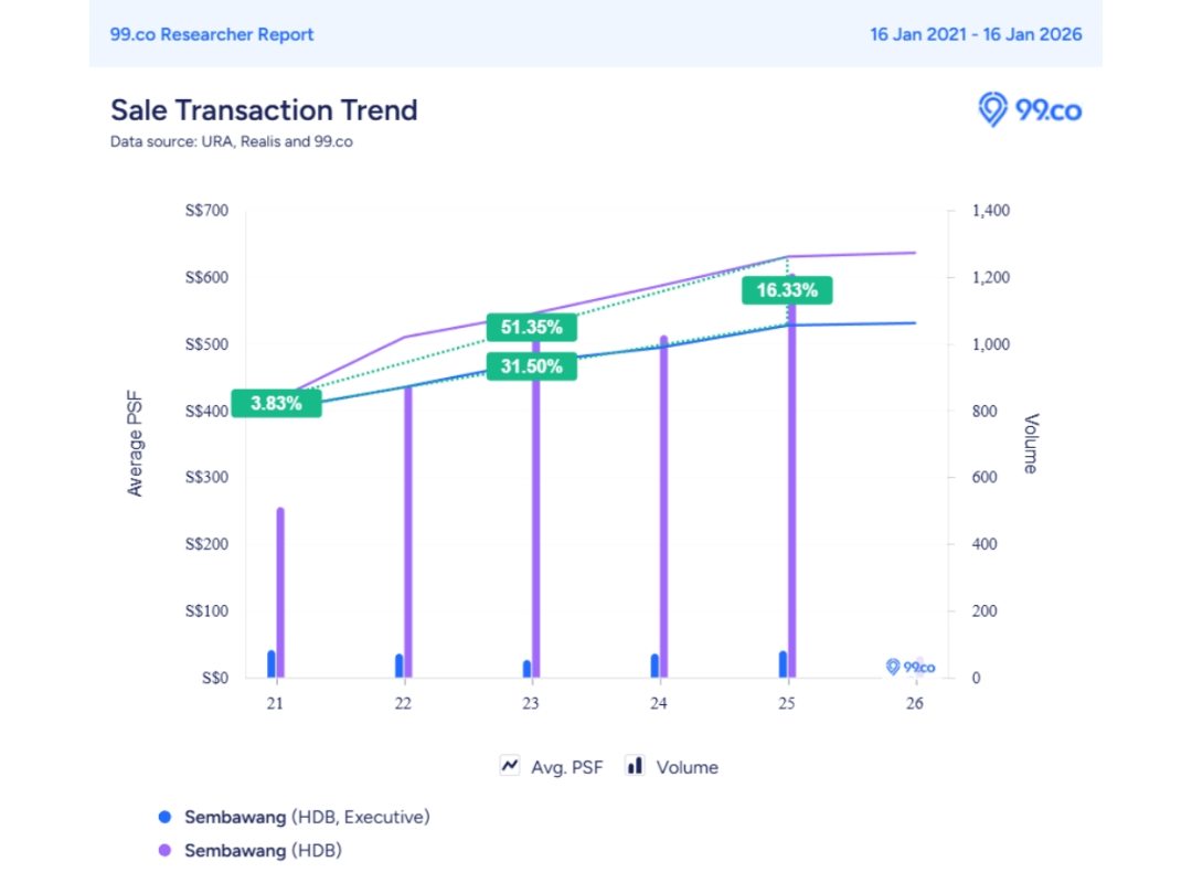 从宏观视角看,三巴旺的组屋转售市场在过去几年呈现清晰而稳定的增长。从2021年至2025年,该市镇公寓式组屋的平均尺价上涨了约51.35%。同期,三巴旺所有户型的价格整体上涨约31.5%。