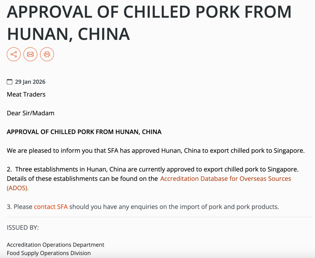 新加坡食品安全局于1月29日发出公告,正式批准中国企业向本地出口冰鲜猪肉了。