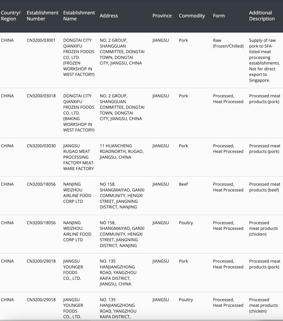 例如辽宁省牛肉、羊肉、家禽、冷冻猪肉都有卖到新加坡。江苏、上海、浙江等则以猪肉、家禽为主。福建也以牛肉和家禽为主。