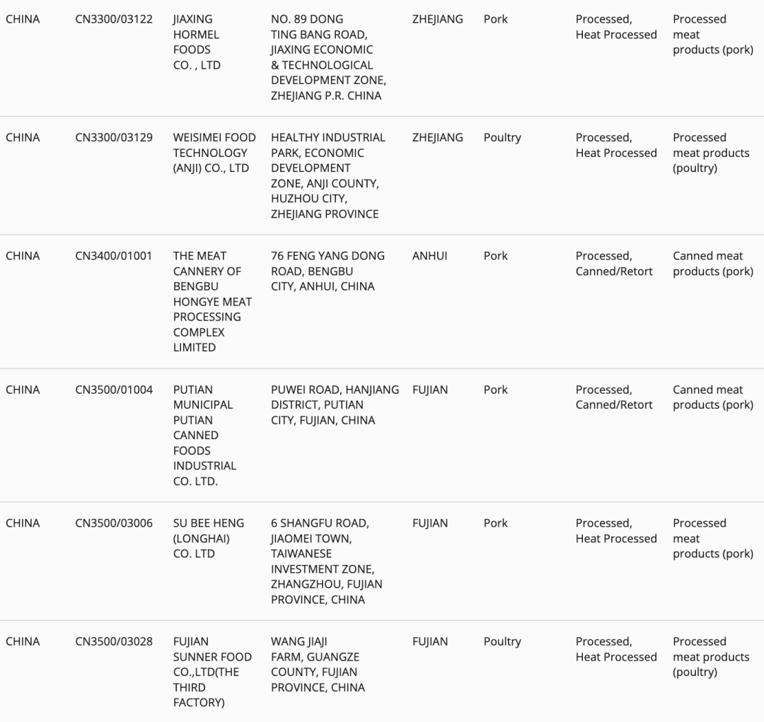 这次获批的,是来自中国湖南省的三家猪肉企业。