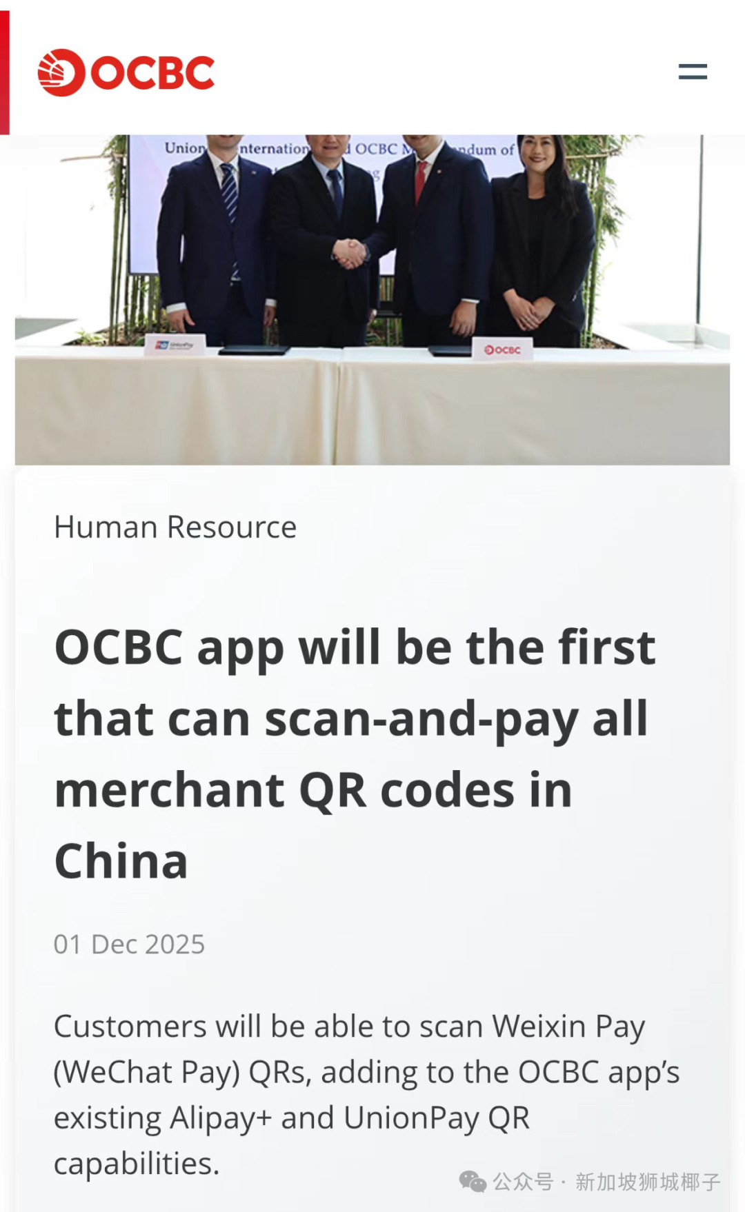 你可直接通过 OCBC手机应用,扫描中国商户的微信支付二维码付款