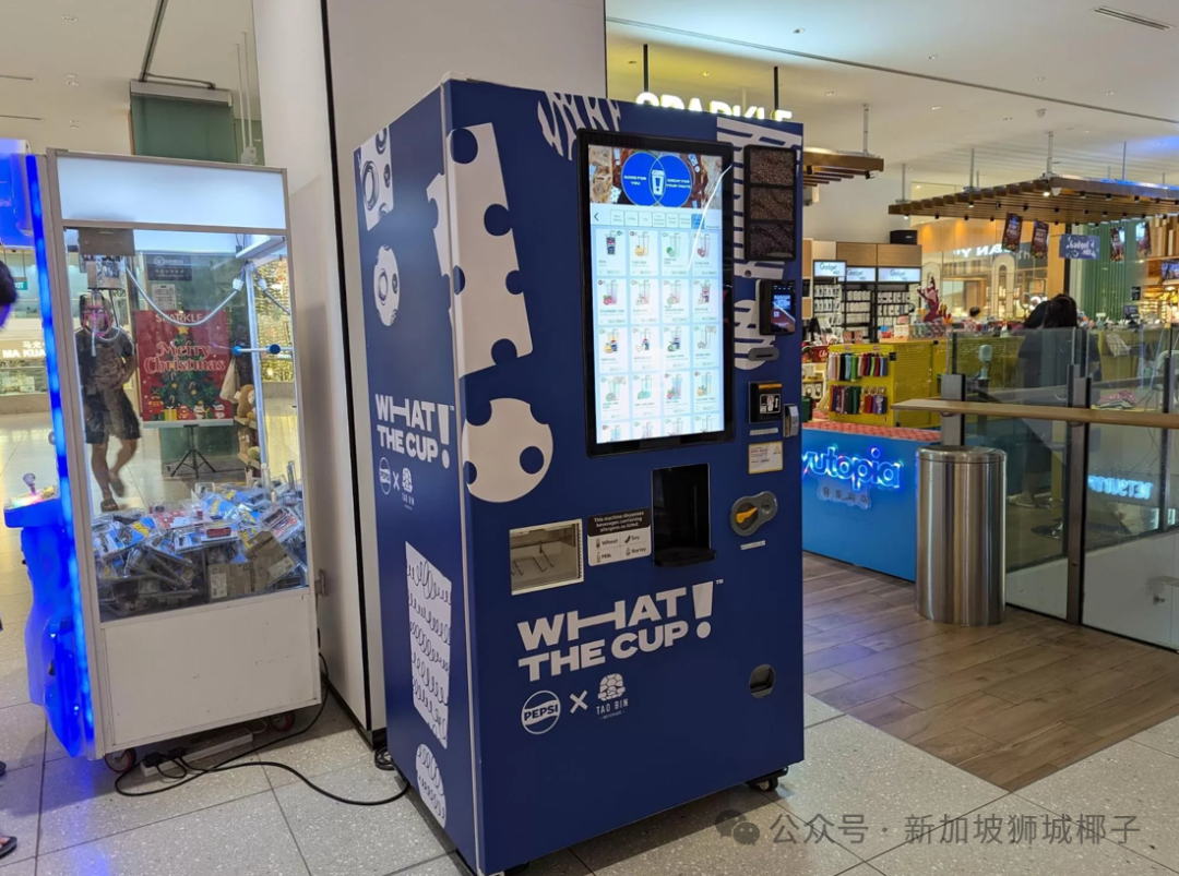 What The Cup 蓝色自动售货机含 300 种饮品,涵盖咖啡、茶、奶昔等,起价 2 新元,独特款风味佳,无盖为唯一缺点,性价比远超咖啡馆。