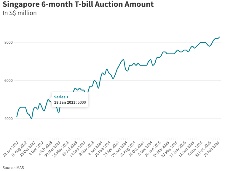 本次发行的国库券金额为83亿新元,较2月26日的上一次拍卖略有增加。