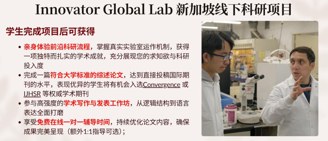 学生将在实验室中完成真实实验,采集并分析一手数据,并在导师指导下完成论文写作与成果呈现。Patrick 也将在讲座中独家分享更多新加坡线下科研资源。