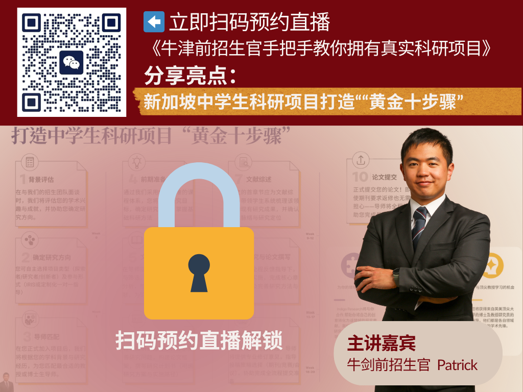 4月11日周六早上10点,拥有7年以上本科升学辅导经验牛津大学前招生官的Patrick,将首次公开新加坡中学生科研路线图!