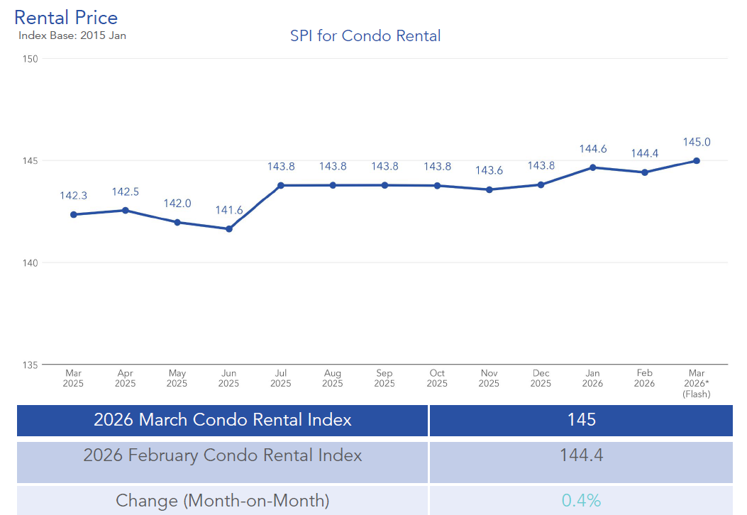 虽然增长步伐相对温和,但值得注意的是,公寓租金价格指数(SPI)在2026年3月达到了145的历史新高。这表明,虽然增长是渐进的,但价格水平仍然居高不下。