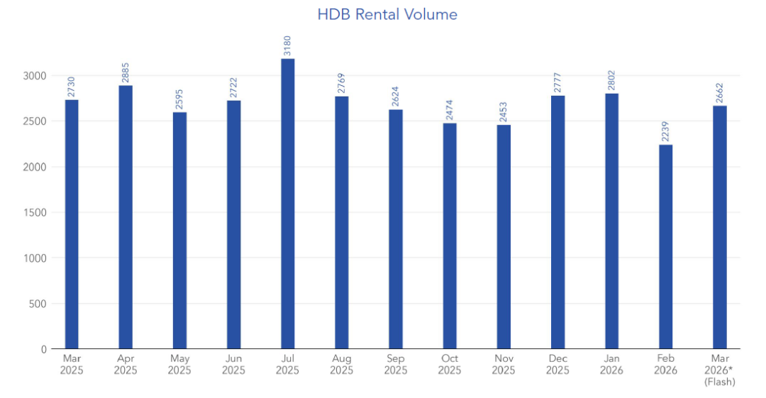 与公寓市场类似,组屋租赁量在3月份也出现了显著增长。交易量环比增长18.9%,估计有2662套组屋出租,高于2月份的2239套。