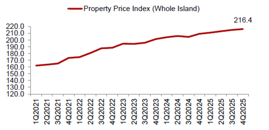 同比来看,整体公寓租金比2025年3月高出1.9%。分地区来看,核心中央区(CCR)租金上涨2%,其他中央区(RCR)上涨1.9%,中央区以外(OCR)上涨0.9%。虽然这些涨幅并非微不足道,但与早期出现的更急剧的峰值相比,它们仍然相对受控。