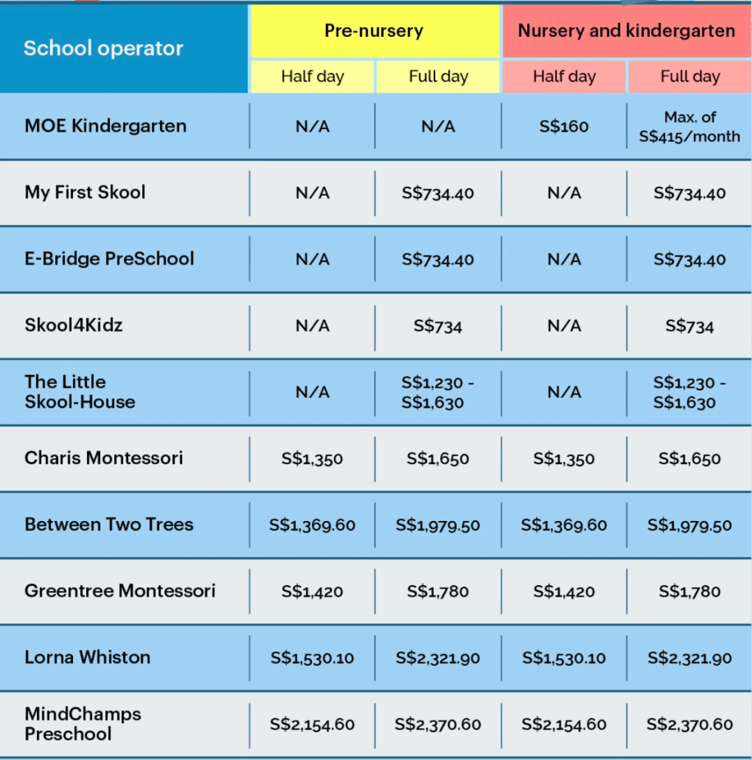 其中公立幼儿园,即教育部幼儿园如PCF Sparkletots Preschool、My First Skool、My World Preschool、Skool4Kidz 和 E-Bridge Preschool每月收费大致标准如下: