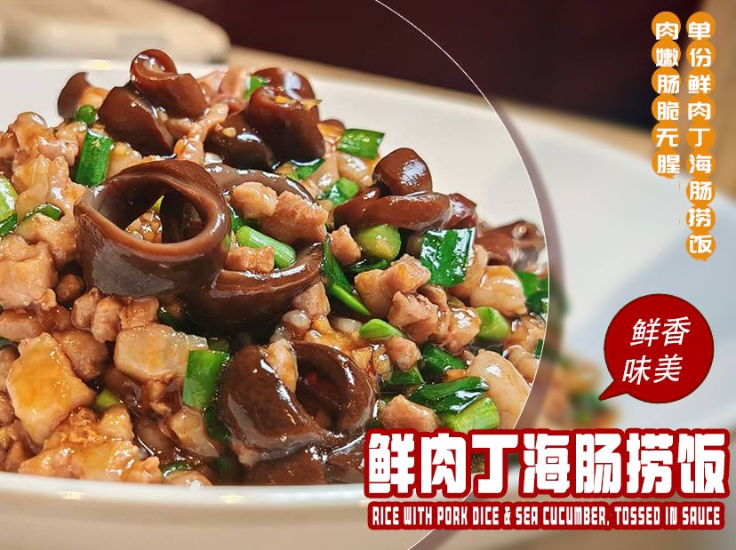 新鲜猪肉丁腌制入味、嫩到弹牙,海肠处理干净无腥、爽脆 Q 弹,咸香鲜酱汁裹满米饭,醇厚不腻,肉香混搭海鲜鲜甜,一口入魂,越吃越上头。