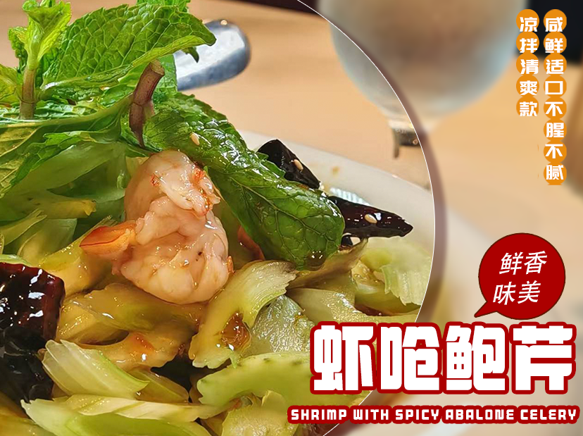 虾呛鲍芹 爱吃凉拌菜的朋友千万别错过这道!精选新鲜大虾,处理干净后烹饪得紧实弹口,每一口都能感受到虾肉的鲜甜。