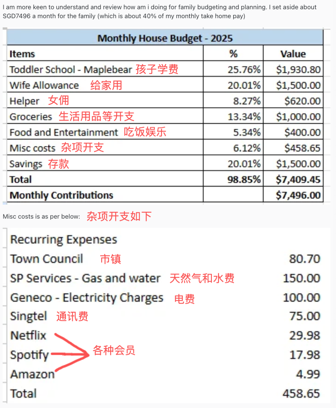 (以下是一位Reddit网友分享的家庭月支出清单,没有包括房贷车贷)