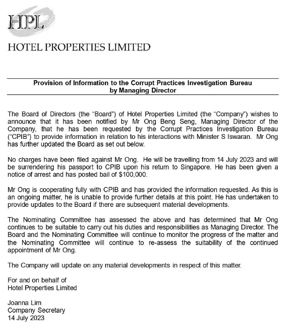 而旅店置业(Hotel Properties)也在今天一早就发布声明:贪污局向王明星发出了逮捕令,但并未提控,目前他已经缴纳了10万新币(约539900人民币)的保释金。