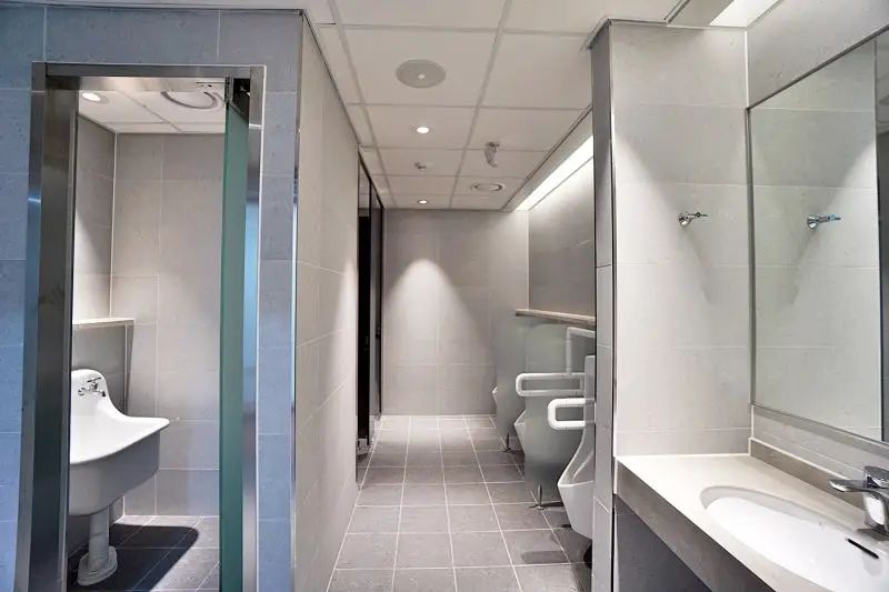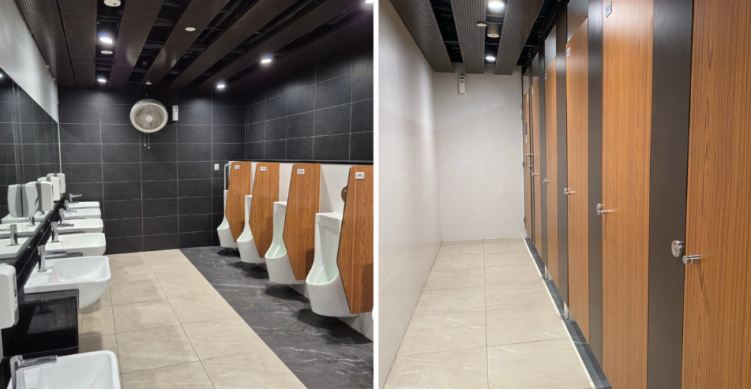 Raffles Place MRT的厕所 具现代工业风,有小便池隔板和坐浴盆,清洁人员忙碌,女厕残疾人隔间维护佳,设施保养好。