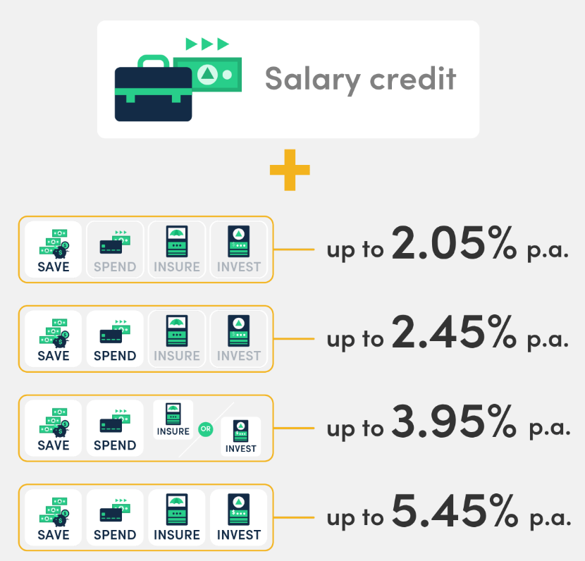 另外,它的基本年利率为0.05%,然后会根据你的存入工资、信用卡消费(每月最低500新币)、余额增长、保险和投资等情况,给你提供不同的奖金。