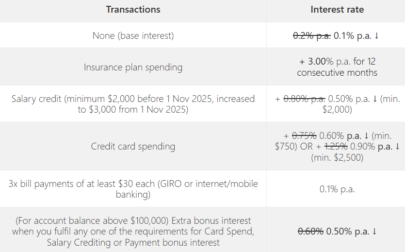 这个户头的基础利率也从0.4%降到了0.2%后,本月再度降低到0.1%。而账户内维持10万新币以上存款的奖励也微降到0.5%。