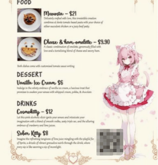 根据她们晒出的菜单,一份火腿滑蛋9.9新。造型做出猫猫状的意面售价21新。图源:女网红社媒账号