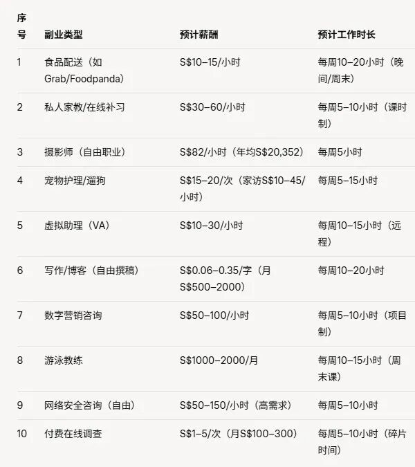 比较常见的作为第二份工作的职业、收入和工作时长如下表所示: