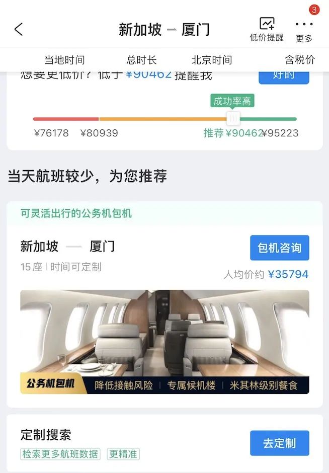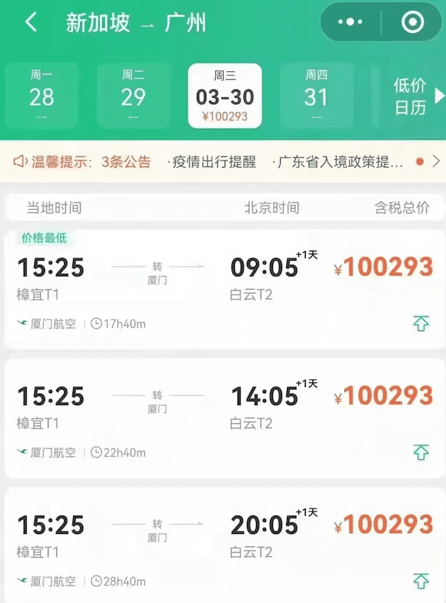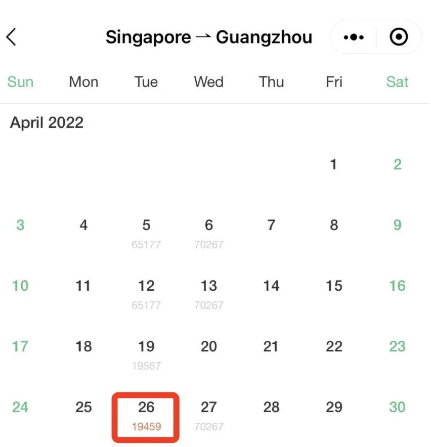 在笼统搜索新加坡回国机票,查看整月价格时,确实出现那么一天两天跳出了10万+机票。↓