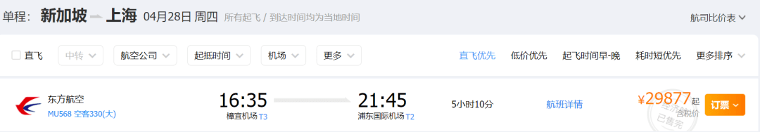 3月、4月已无航班,5月唯一一趟航班机票经济舱票已抢空。