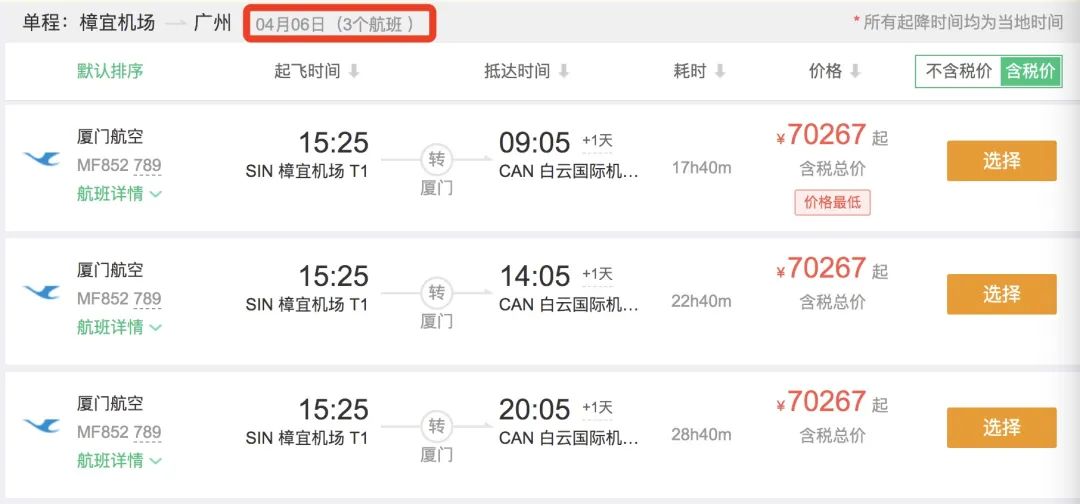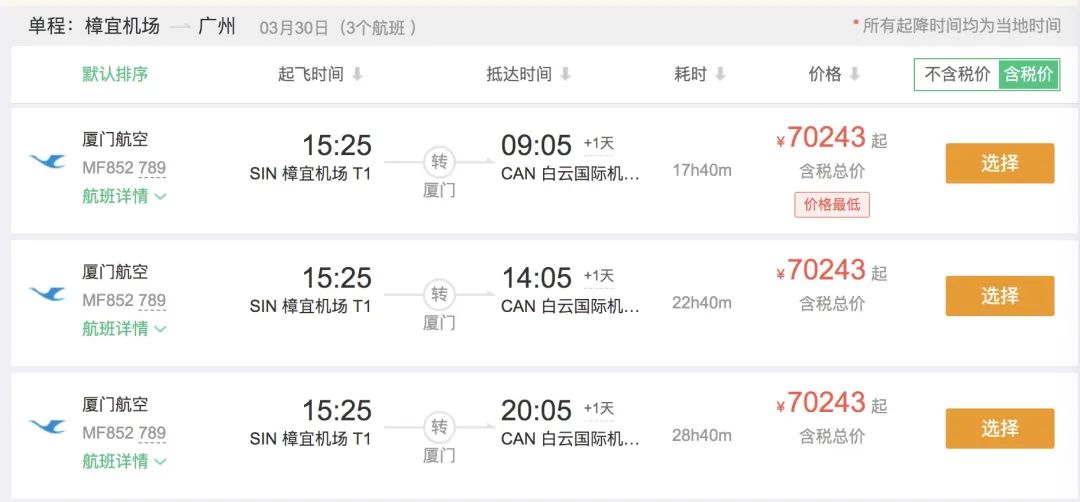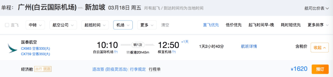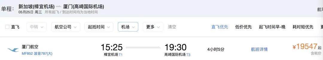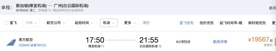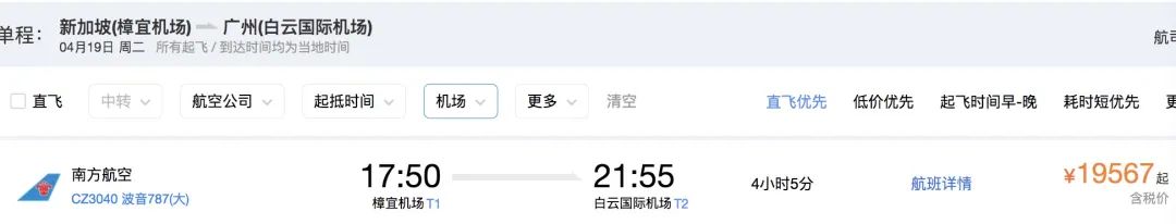 但1万9的价格是从新加坡直飞到广州,约4个小时左右。而6万+都是转机价,最短也得17个小时多。↓