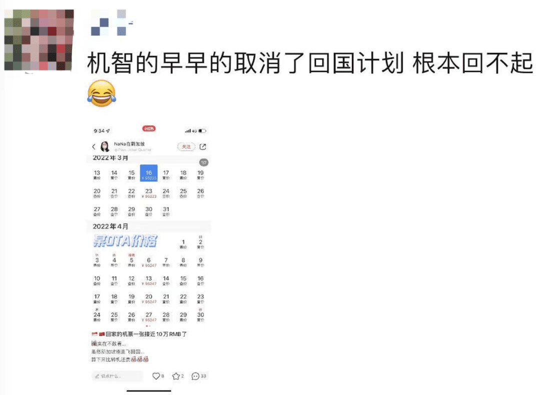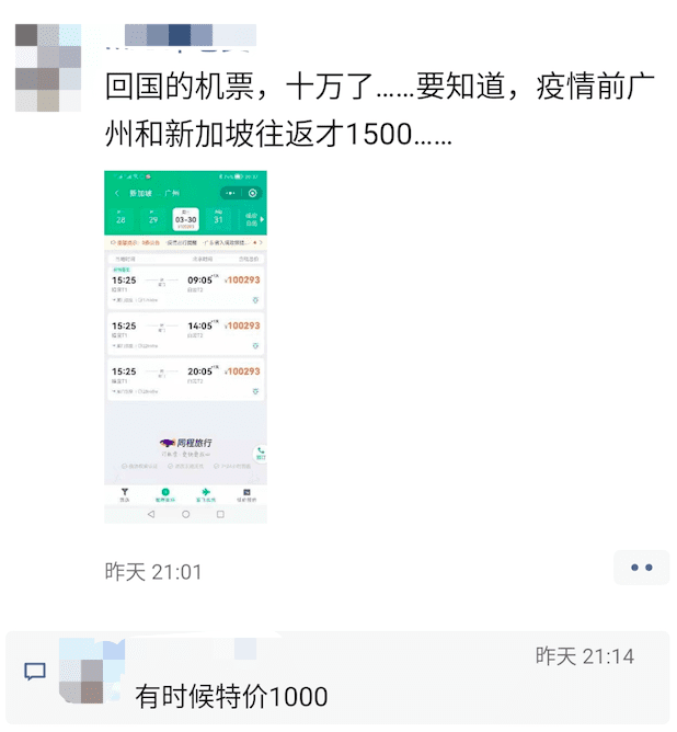 转机票价10万,并不能反应现在新加坡回国的真实机票水平。