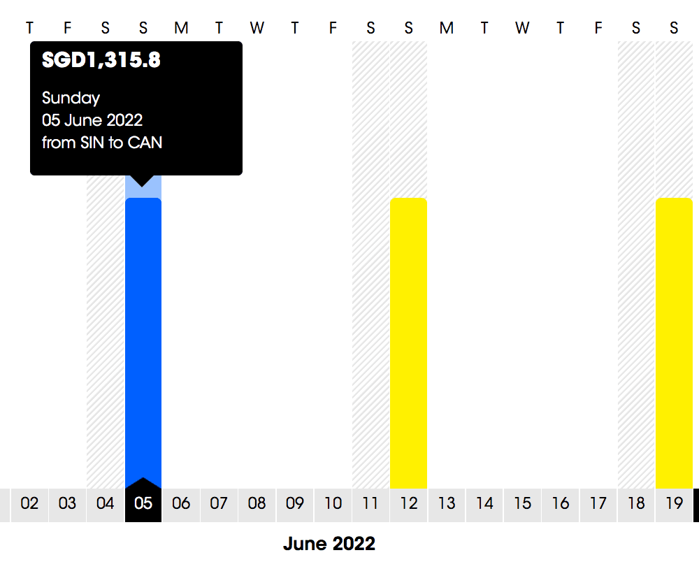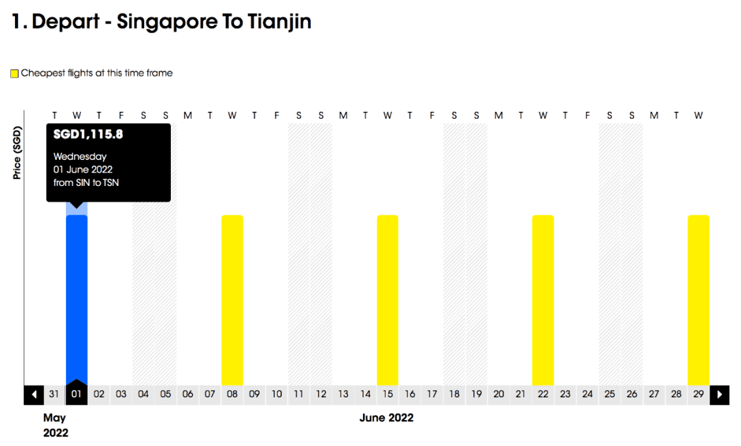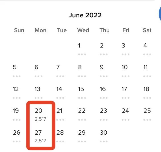 最低价机票日为6月1日、8日、22日、29日,价格为¥5427。↓