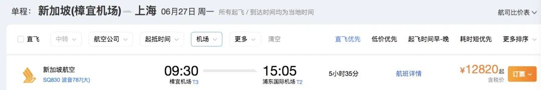 低价机票日为6月27日,新航执飞,¥1万2484。↓