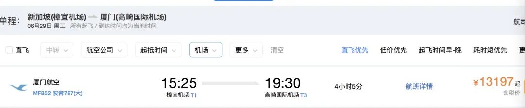 低价机票日为6月29日,厦航执飞,¥1万3197。↓