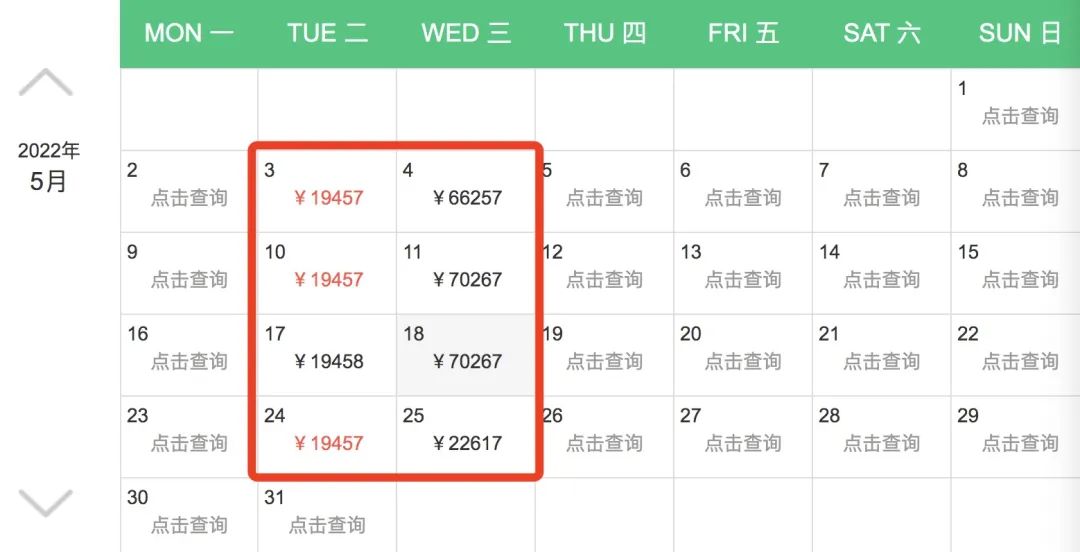 最低价机票日为5月25日,价格为¥1万9547。↓