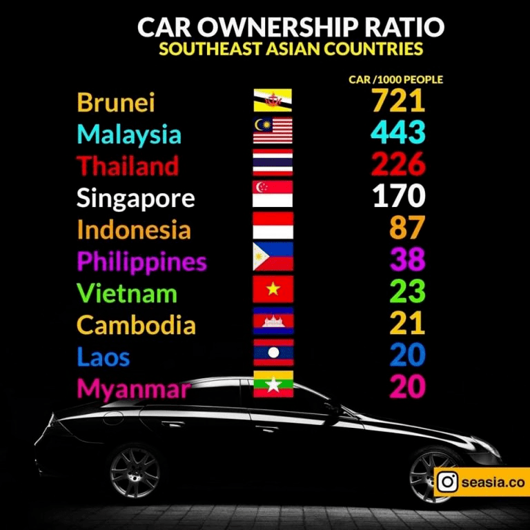 因此,新加坡在东南亚地区的拥车率也不是很高了,每一千人只有170辆辆汽车,远远低于邻国马来西亚的443辆。