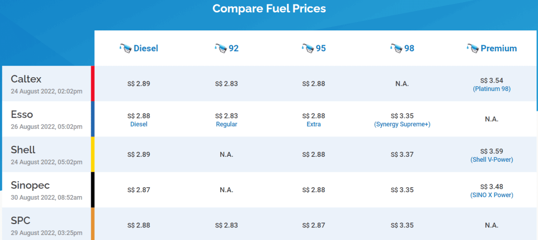根据新加坡本地汽油价格对比网站Fuel Kaki的数据,无论是柴油和各型号的汽油,现在价格都是不太便宜的。