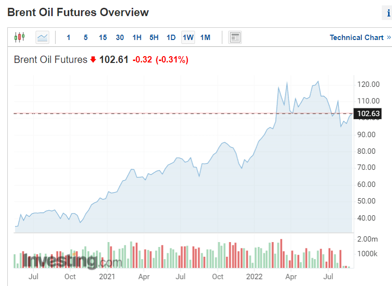 受到战争带来的震荡,全球原油价格飙升。布兰特原油期货价格,现在依然处于100美元以上的关口。