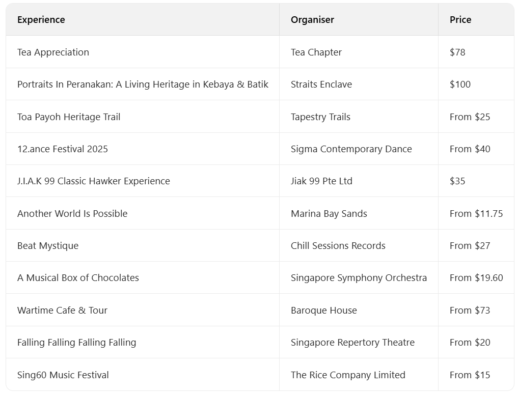 - SG 文化通可兑换 11 种新加坡文化体验,涵盖茶文化品鉴、土生华人摄影、历史步道、舞蹈节、小贩美食体验等,价格 11.75 至 100 新元不等,涵盖艺术、历史、音乐、美食多领域,适配家庭、年轻人等不同群体,100 新元额度可轻松解锁多样本地文化。