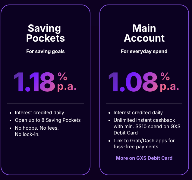 对于那些不需要账户接入实体ATM机或银行分行的人,你也可以考虑数字银行的产品,例如GXS储蓄账户,它提供有竞争力的利率(范围在 1.08% 到 1.18%)。