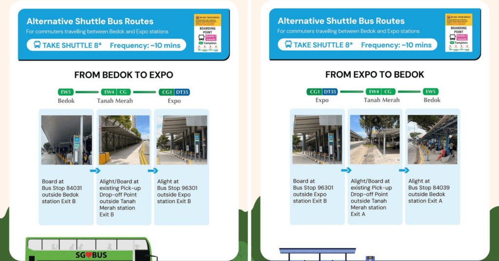 - 受影响的线路为Bedok至Tampines段及Tanah Merah至Expo段,期间将提供 7 号和 8 号接驳巴士及接驳列车、Downtown Line可作为替代选择,走此路线预计会增加约 30 分钟行程时间。