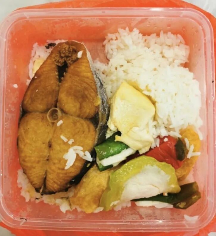 最近还有一个网友去爆料本地的小贩中心打包杂菜饭,点了如下图1片鱼肉、3到4块酿豆腐外加米饭。