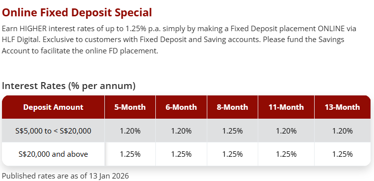 另外一种则必须通过手机应用程序HLF Digital完成存款,存期选择更多,利率也比通过柜台存略微高出0.02%!且只要存款金额超过2万新,不管存5个月还是13个月,都能享受1.25%的利息!适合那些想长期锁定优惠利率的用户哦~