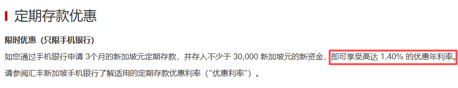 汇丰银行尊享用户,可以享受到3个月1.40%的最佳定存利率。但需要至少存入30000新币,且只能通过手机银行存入!(其他存入方式均无法享受)