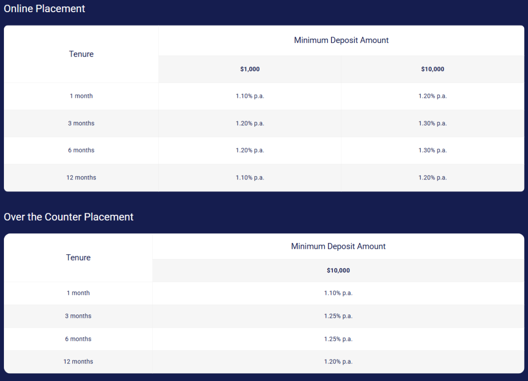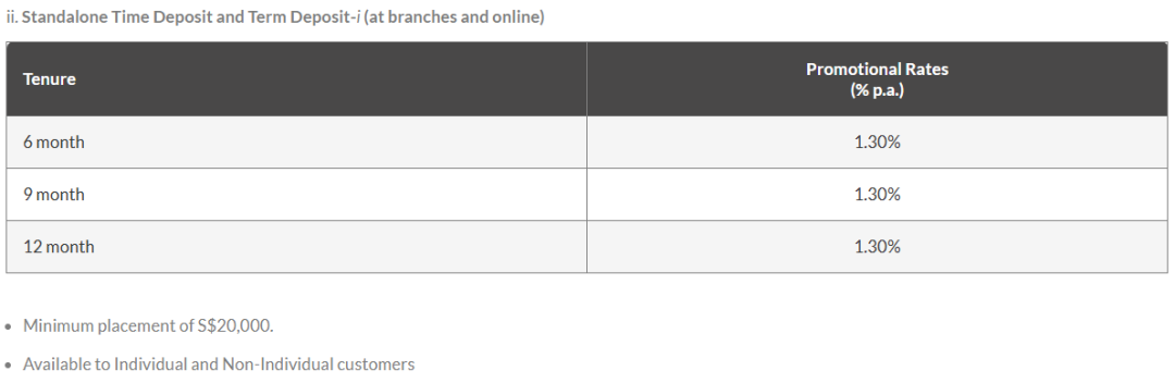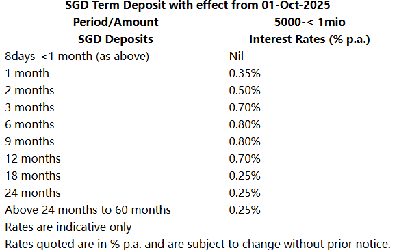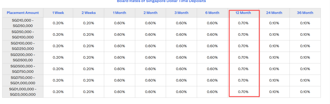 目前,该公司提供的最佳定存利率为3/6个月的1.30%。但需要注意,存入10000新币和只存1000新币,同样存期能够获得的利率有差异。