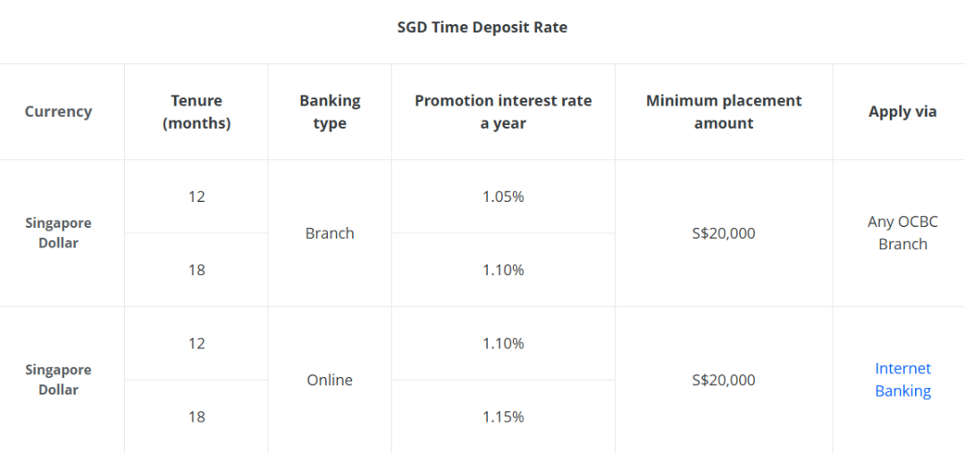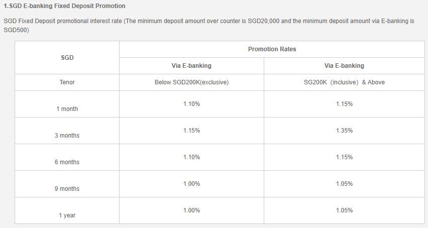 如果起存金额在20万新币以内,同样的存期优惠利率只有1.15%。