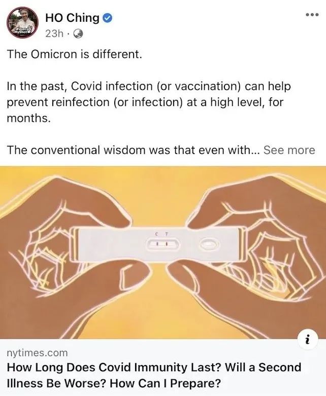 前几天,总理夫人何晶曾引用一篇新闻《新冠免疫力能维持多久...》提到有人间隔20天二度感染新冠。